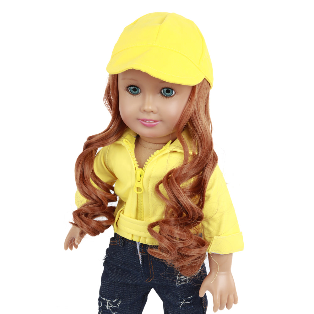 Yellow Faux Leather Jacket with Blue Jeans and 1 pair of sneakers and Yellow Baseball Wig Cap w/Curly Hair, fits 18 inch Doll